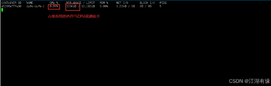 在检查 dufs 的资源占用情况后,我们发现 dufs 容器的实际资源消耗非常低,这表明它在资源利用上极为高效,不仅能留出更多空间给其他应用程序,同时也确保了服务器资源的合理分配与充分利用,提升了整体系统性能。