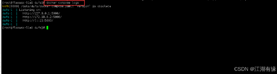 [root@flexusx-51a1 dufs]# docker compose logsWARN[0000] /data/dufs/docker-compose.yaml: `version` is obsoletedufs-1 | Listening on:dufs-1 | http://127.0.0.1:5000/dufs-1 | http://172.18.0.2:5000/dufs-1 | http://[::1]:5000/dufs-1 |