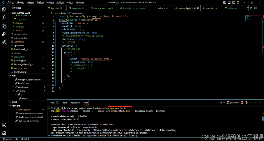 接下来我们打开 Vue 项目,执行 npm run build 命令打包项目,