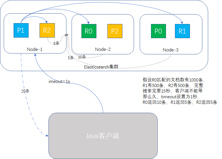 为了防止这一情况,我们使用timeout参数,告诉shard允许处理数据的最大时间,时间一到,执行关门动作,能有多少数据返回多少数据,剩下的不要了,这样可以确保集群是稳定运行的,如下图所示: