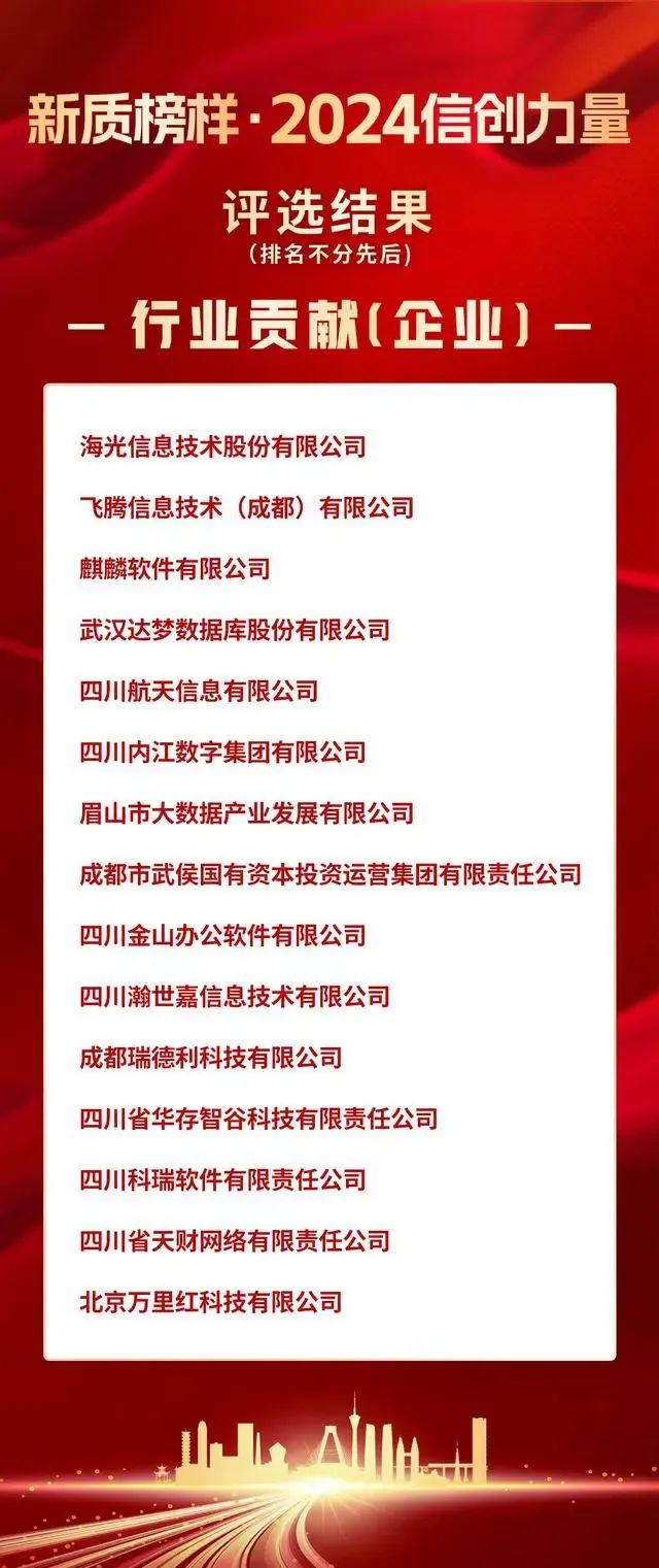 • “新质榜样·2024信创力量”评选圆满落幕:2024年12月31日,由封面新闻、四川省计算机学会、四川省信创产业联盟主办的“新质榜样·2024信创力量”评选结果揭晓。海光信息技术股份有限公司等15家企业获行业贡献(企业)奖,奉天和等9人获行业贡献(个人)奖,麦麟软件有限公司等4家企业被评为最具投资价值企业,武汉达梦数据库股份有限公司等20家企业获得最佳技术解决方案。这一评选活动旨在表彰在信创领域具有突出贡献和创新能力的企业和个人,激励更多企业投身信创产业发展。