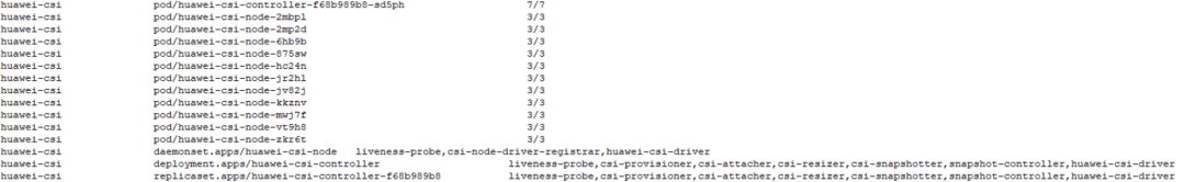比如说华为存储提供的CSI接口中,有csi node和csi controller组件,node以daemonset方式部署在每个K8s节点上,controller以deployment部署。其中Node Pod中有3个容器/组件,Controller Pod中有7个容器/组件。