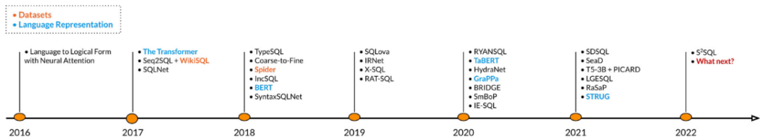 深度学习text-to-SQL系统、数据集和语言表示技术的时间线