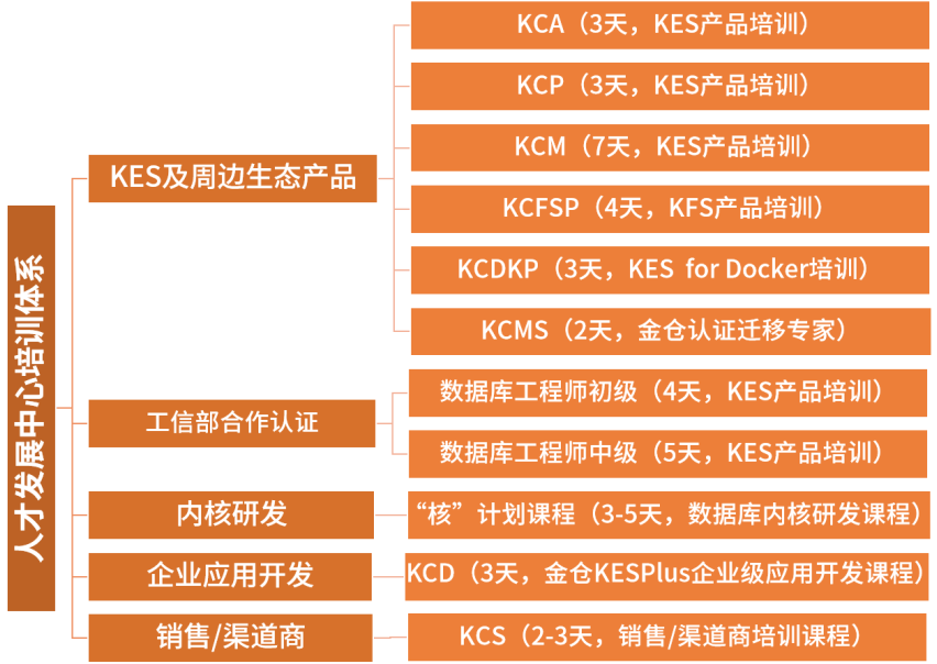 作为人才自主培养落地主体,人才发展中心坚持“强基固本,立德树人”理念。认证课程的丰富性和课件质量是中心生命线,依托金仓20多年沉淀的理论基础和应用实践,以及在过去5年积累的丰富人才培养经验。构建了5大类11个认证培训课程,全方面满足社会上人才生态培养/金仓人力培养的需求。