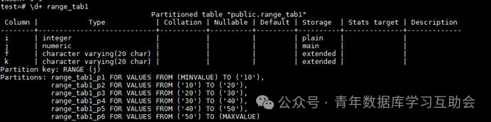 上面是一个简单的范围分区表的案例,表range_tab1共包含6个分区,其中分区p1的取值为小于10的数,分区p6为任何大于50的数,PARTITION BY RANGE(j)语句中的j代表的是根据表中的j****列的数值来进行分区。