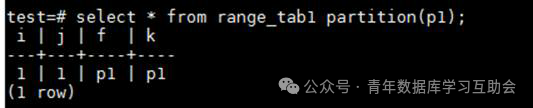 使用select * from range_tab1 partition(p1);语句可以查询具体分区中的存在的数值