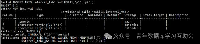例如,执行INSERT INTO interval_tab1 VALUES(11,'p2','p2');
