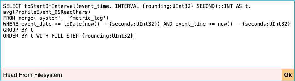 -- Load dashboard definitionSELECT title, query FROM system.dashboards WHERE dashboard = 'Overview'