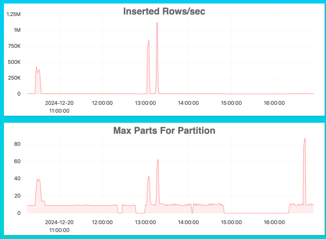 如上图所示,从 13 点到 14 点之间,每秒插入行数和每个分区的最大部分数出现了两次峰值。这表明数据摄取速度是合理的。