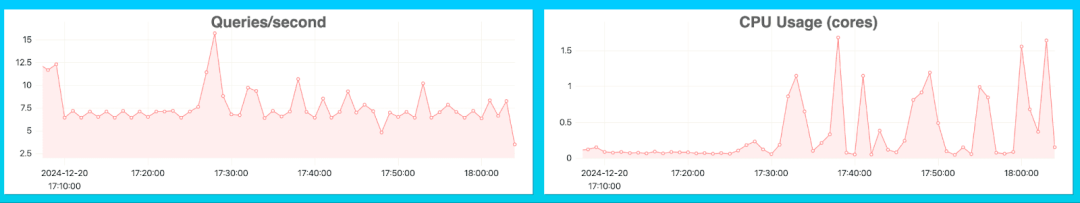 以下是一个 CPU 使用率达到峰值,但每秒执行的查询数量未发生显著变化的示例: