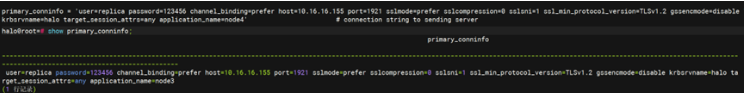 primary_conninfo = 'user=replica password=123456 channel_binding=prefer host=10.16.16.155 port=1921 sslmode=prefer sslcompression=0 sslsni=1 ssl_min_protocol_version=TLSv1.2 gssencmode=disable krbsrvname=halo target_session_attrs=any application_name=node3'