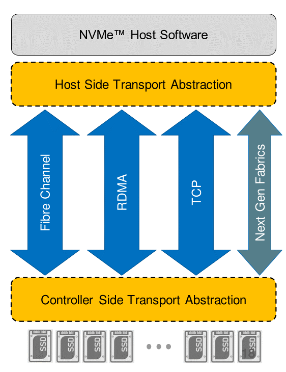 除了 NVMe 基本规范外,该组织还负责其他几项规范:NVMe over Fabrics (NVMe-oF™) 和 NVMe Management Interface (NVMe-MI™),前者基于网络连接架构使用 NVMe 命令,后者则用于在服务器与存储系统中管理 NVMe/PCIe SSD。NVMe 规范是从零开始专为 SSD 而设计的规范。它是更高效的接口,相比于串行 ATA (SATA) 之类的传统接口,它能够为 SSD 提供更低的时延和更高的可扩展性。此规范的第一部分对应的是主机控制接口。NVMe 体系结构引入了全新的高性能排队机制,支持 65,535 个 I/O 队列,每个队列含 65,535 条命令(称为队列深度或者未完成命令数)。队列映射到 CPU 核心,提供可扩展的性能。NVMe 接口显著减少了存储器映射输入/输出命令的数量,并且能够调整操作系统设备驱动程序,使其在中断模式或轮询模式下运行,从而提升性能并降低时延。NVMe 规范还包含适用于 SSD 命令的主机到设备协议,供操作系统用于:读取、写入、清空、TRIM、固件管理、温控、报错等操作。如需获取最新版本的 NVMe、NVMe-oF 和 NVMe-MI 规范,可访问 NVM Express 组织官网。NVMe 协议并非局限于在服务器内部连接本地闪存驱动器,它还可通过网络使用。在网络环境内使用时,网络“架构”支持在存储器与服务器各元素之间建立任意对任意连接。NVMe-oF 支持企业创建超高性能存储网络,其时延能够比肩直接连接的存储器。因而可在服务器之间按需共享快速存储设备。NVMe-oF 可视为基于光纤通道的 SCSI 或 iSCSI 的替代品,其优势在于时延更低、I/O 速率更高,且生产力更优。服务器(或其他主机)通过网络架构与 NVMe 存储器直接进行通信,或者通过控制器与之进行间接通信。如果存储器解决方案使用控制器,那么控制器就会与自己的存储器目标进行通信,可采用的方式包括 NVMe-oF(如菊花链)或者其他专属或非专属解决方案。这取决于存储器供应商的实现方法和选择。基础架构工程师需要了解以下三种传输绑定,才能在自己的数据中心内操作 NVMe-oF:光纤通道 (NVMe/FC):具有 Broadcom / Emulex 或 Marvell / Cavium / QLogic 主机总线适配器 (HBA) 等设备的 NVMe 发起方(主机)可以通过专属光纤通道 (FC) 架构或者基于以太网的光纤通道 (FCoE) 架构来访问 NVMe 目标。光纤通道传输通过 FCP Exchange 使用基于光纤通道协议的 NVMe (FC-NVMe),将 NVMe 的“控制平面”封装体(命令和响应)和“数据平面”数据消息映射到光纤通道帧。TCP (NVMe/TCP):NVMe 主机和控制器以交换 NVMe/TCP 协议数据单元(NVMe/TCP H2C 和 C2H PDU)的方式,通过 TCP 进行通信。NVMe/TCP PDU 可用于传输 NVMe 的“控制平面”封装体(命令和响应)和“数据平面”数据。对于 NVMe/FC,这种数据传输“仅含消息”。远程直接内存访问(InfiniBand 或以太网网络上支持的 NVMe/RDMA):RDMA 是主机卸载、主机旁路技术,支持包括存储器在内的应用程序与另一个应用程序的存储空间之间直接执行双向往来数据传输。支持 RDMA 的以太网 NIC (rNIC) 或者 InfiniBand 领域内的 HCA(不包括主机)均负责管理 NVMe 源与目标之间的可靠连接。凭借 RDMA,即可使用消息来传输 NVMe“控制平面”封装体(命令和响应),并使用存储器语义(如 RDMA 读/写操作)来传输“数据平面”(数据)。您必须将数据平面部分视为类似 PCIe 的直接内存操作。除了这三种解决方案外,还有其他专属解决方案可以让您在网络架构基础上使用 NVMe 命令。直接内存访问 (DMA) 指设备无需 CPU 干预即可直接访问主机内存的能力。远程直接内存访问 (RDMA) 也就是在不中断远程机器系统 CPU 处理的情况下对该机器上的内存执行访问(读取和写入)的能力。零复制:应用程序无需网络软件栈的参与即可执行数据传输。数据可以直接发送和接收到缓冲区,无需在网络层之间复制。内核旁路:应用程序可以直接从用户空间执行数据传输,无需内核参与。无 CPU 参与:应用程序无需在远程服务器内耗用任何 CPU 时间即可访问远程内存。无需任何远程进程(或处理器)的干预即可读取远程内存服务器。此外,远程 CPU 的高速缓存不会被访问的内存内容填满。要使用 RDMA,需要具备 RDMA 功能的网络适配器:支持 RDMA 的以太网 NIC (rNIC),如 Broadcom NetXtreme E 系列、Marvell / Cavium FastLinQ 或 Nvidia / Mellanox Connect-X 系列。或者 InfiniBand 领域内的 InfiniBand 主机通道适配器 (HCA)(同样以 Nvidia / Mellanox Connect-X 为例)。由此您可能已经推断出,网络的链路层协议既可以是以太网,也可以是 InfiniBand。这两种协议均可用于传输基于 RDMA 的应用程序。在 Linux、Windows 和 VMware 这三种操作系统内置 RDMA 支持功能。在其他操作系统上,或者需要使用高级功能时,您可能需要下载并安装相关的驱动程序包并对其进行正确配置。现在我们已经知道,RDMA 是用于通过网络架构传输 NVMe 的三种选项之一,接下来,我们来看看 RDMA 的三种类型:1. InfiniBand:InfiniBand 网络架构原生支持 RDMA。2. RoCE(基于聚合以太网的 RDMA,读作“Rocky”):这种类型基本上就是基于以太网网络的 RDMA 的实现。其方式是通过以太网来封装 InfiniBand 传输包。RoCE 有两种版本:RoCEv1:以太网链路层协议(以太网 0x8915),支持在相同以太网广播域内任意两个主机之间进行通信。因此,仅限第 2 层网络,不可路由。RoCEv2:利用 UDP/IP(IPv4 或 IPv6)报头增强 RoCEv1,因此增加了第 3 层网络可路由性。NVMe/RoCEv2 默认使用 UDP 目标端口 4791。3. iWARP(互联网广域 RDMA 协议):按 IETF 标准拥塞感知协议(如 TCP 和 SCTP)分层。具有