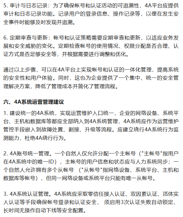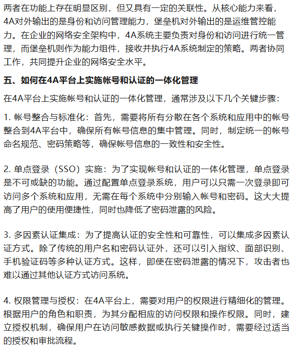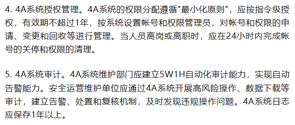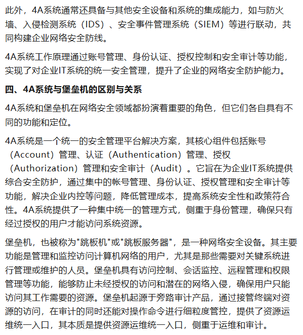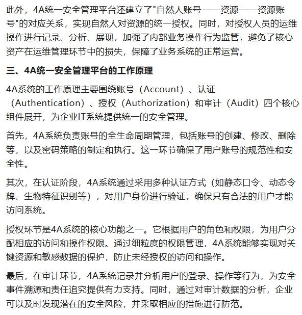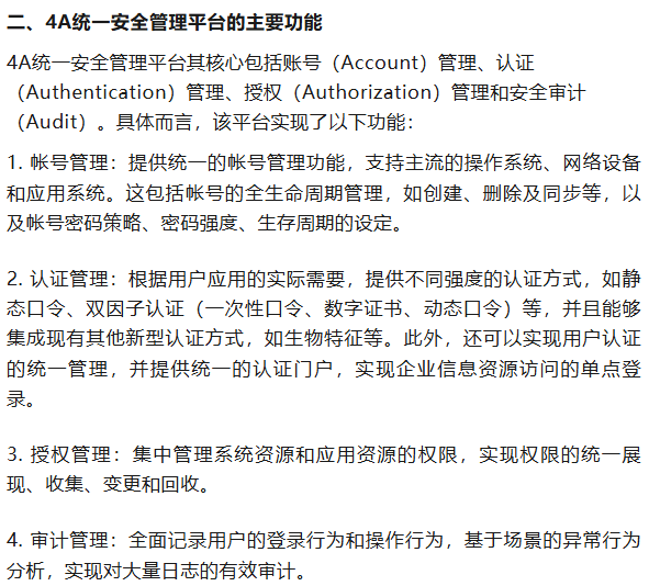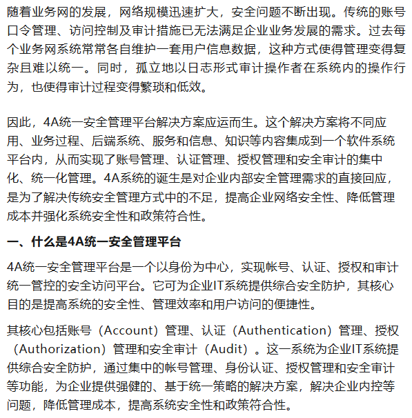 对生产环境管控较强的企业,常听到4A平台,4A是Account(账号)、Authentication(认证)、Authorization(授权)、Audit(审计)缩写,4A平台通常叫"统一安全管理平台"。