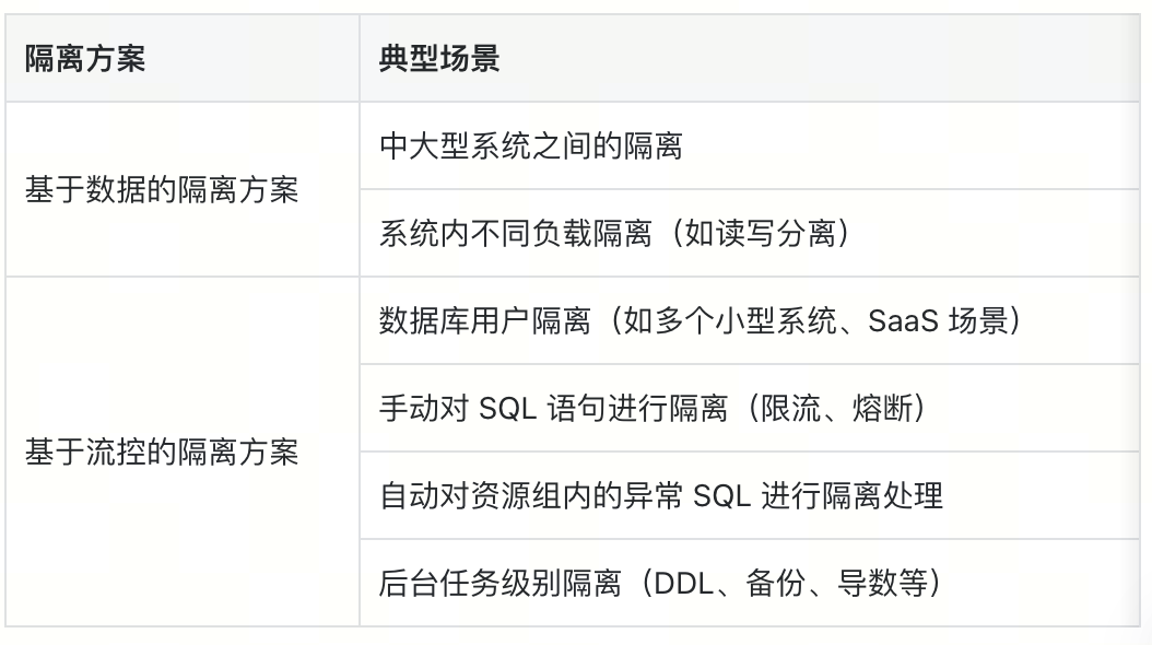 提供数据库用户、SQL 语句、后台任务等三个层面的资源隔离