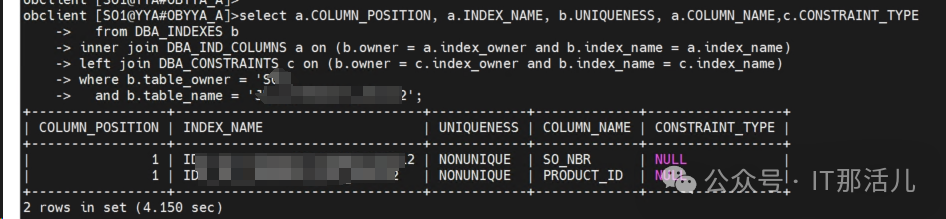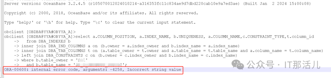 在OB集群的oracle租户下,查询某张表的索引及索引相关字段时,数据库返回“ORA-00600: internal error code, arguments: -4258, Incorrect string value”错误