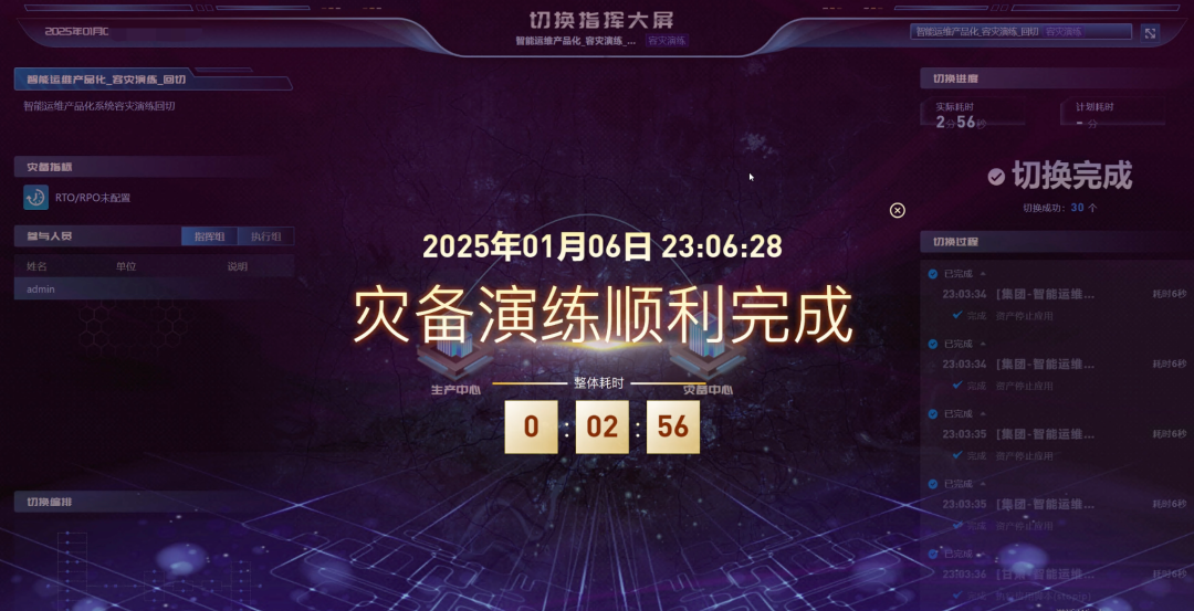 备节点验证切换有效后,演练执行小组利用DRCC自动生成的回切链路,一键完成异地灾备机房的智能生产运维业务回迁至上海本地数据中心,业务正常运行,共耗时2分56秒,完全满足RPO和RTO预期。