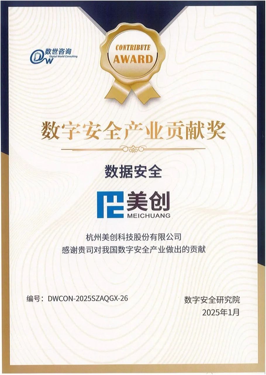 近日,由国内数字化领域独立的第三方调研咨询机构数世咨询主办的“2025数字安全市场年度大会”成功举办。会上,美创科技凭借在数据安全领域的实力和贡献荣获“数字安全产业贡献奖”,再次证明了美创科技在专精赛道的领军地位。