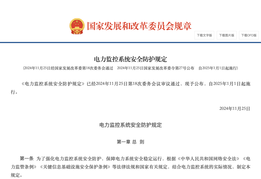 近日,国家发展和改革委员会正式发布了《电力监控系统安全防护规定》,该规定将于2025年1月1日起实施。新规明确了电力监控系统安全防护的基本原则和总体要求,还提出建立系统备用和恢复机制,制定应急预案并定期开展演练,确保电力供应的稳定性和可靠性。