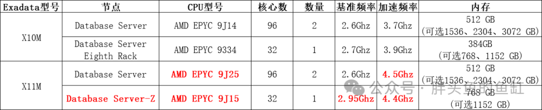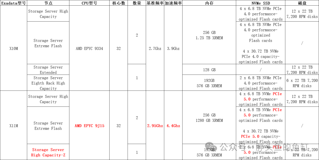 对比X10M和X11M,原来八分之一配置的专属硬件被Server-Z替换,为客户提供数据库服务器的选择,以匹配他们的工作负载要求。例如,需要较少CPU内核的客户,或整合一些虚拟机或数据库。与之前的八分之一配置组件只能用在八分之一配置机架之中不同,Server-Z可以在任意配置机架中部署(包括之前的版本),数据库节点和存储节点现在都分别有两种选择:X11M DB Server、X11M DB Server-Z,X11M Storage Server、X11M Storage Server-Z,可以任意混配,能够更加灵活满足客户不同负载需求。。