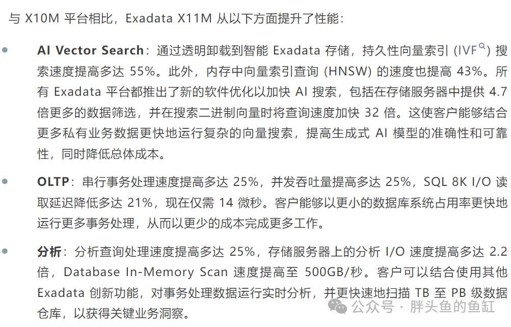 作为23ai正式发布后的第一款Exadata,X11M在针对新一代AMD EPYC处理器优化、使用更快存储硬件的基础上,也针对AI Vector Search进行了对应适配与优化,同时也进一步加强了传统的TP、AP和HTAP能力。