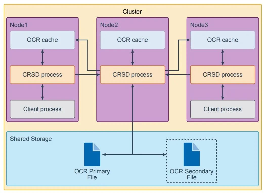 OCR是存放在共享存储中的,所以在整个集群中每个节点都通过本地的CRSD进程去访问OCR缓存在其内存中维护着的一个副本。同时为了保证OCR的完整性,Oracle不允许所有节点都能直接操作OCR,只有一个进程可以对OCR进行修改,这个进程被称为OCR Master。这个进程负责刷新自己本地的OCR cache以及集群中其他节点的OCR cache。换个方式说,每个节点的OCR客户端查询的都是本地的OCR缓存,当这个节点需要对OCR进行一些修改的时候他们将通过本地的CRSD进程与OCR Master进程进行交互来实现自己的修改。