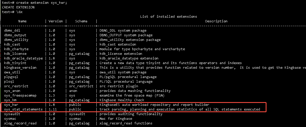 test=# create extension sys_kwr;