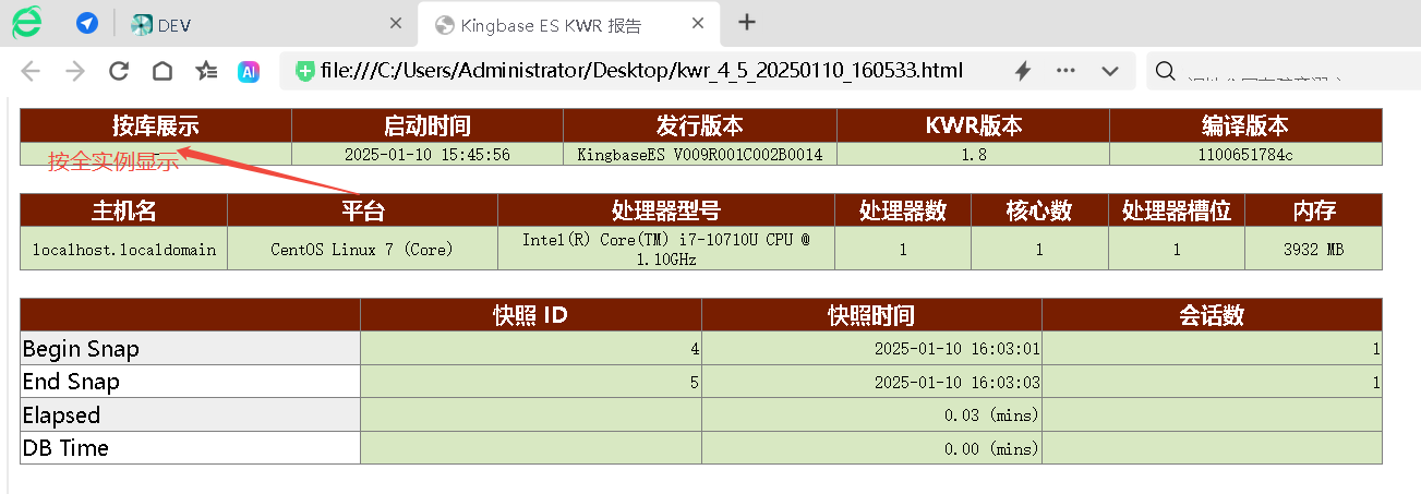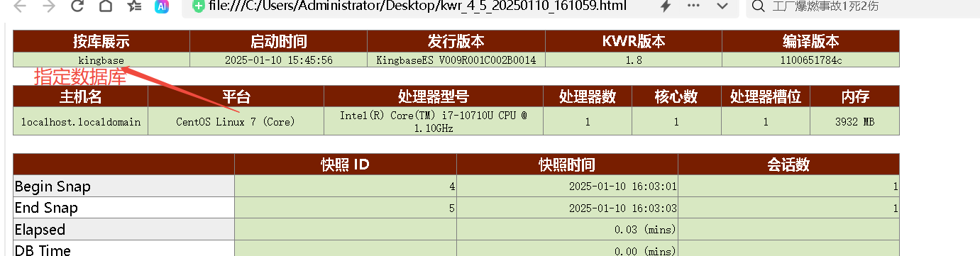 SELECT * FROM perf.kwr_report_to_file(4,5, 'html','/home/kingbase/kwr_kingbase_4_5.html');场景2:生成指定数据库的KWR报告