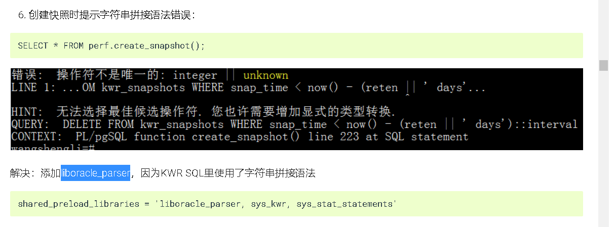 shared_preload_libraries中sys_kwr, sys_stat_statements默认配置的有,liboracle_parser需要手动添加,因为KWR SQL里使用了字符串拼接语法,liboracle_parser起字符串拼接作用,若不添加会报以下错误: