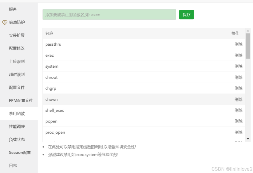 如下图所示,进入宝塔面板,打开 PHP 设置,在【禁用函数】中,删除 putenv、pcntl_signal 以及 proc_open