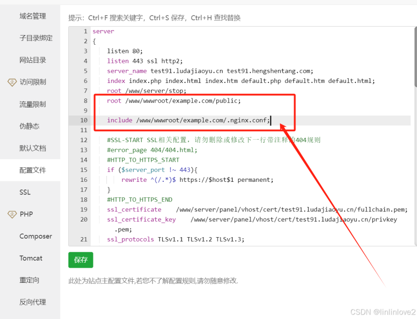 root:需要在路径后面加上 public,比如原本是 root /www/wwwroot/abc.com;,需要修改为 root /www/wwwroot/abc.com/public;。