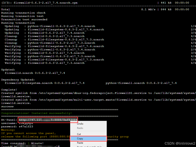 安装完成会打印这些东西(面板 ip 地址、用户名、密码):