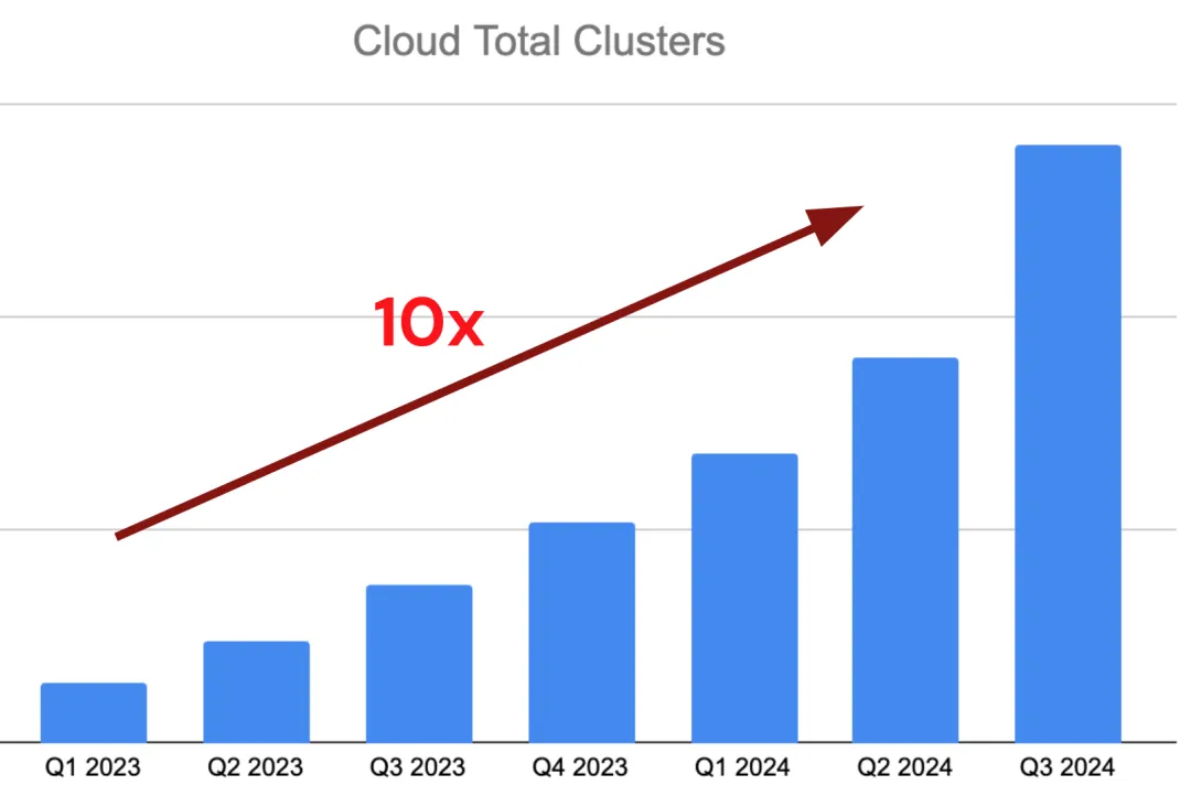 从 TiDB 自己在海内外客户的使用观察来看,最近这几年 TiDB Cloud 的使用量增速惊人,尤其在海外,除了一些银行或者金融机构出于合规的需求的暂时没有办法使用云以外,其他的用户更加接受云的使用,下面这张图是 TiDB Cloud 这两年的集群数的增长情况,相比两年前有了 10 倍的惊人增长。