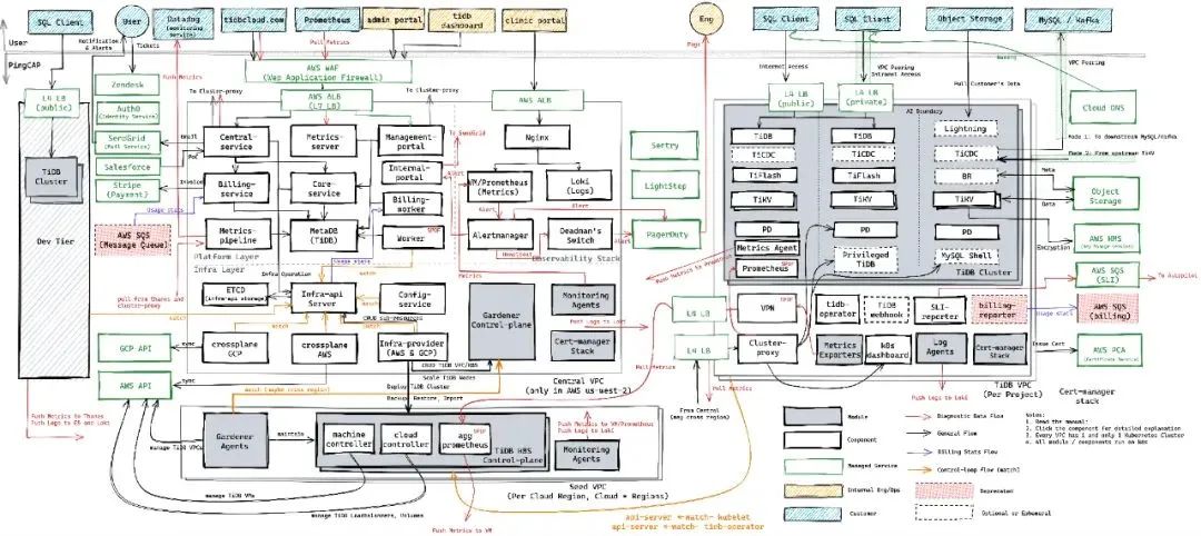 对于厂商来说,可能事情就没有那么简单了,构建一个云服务的复杂性不亚于做一个数据库内核。例如下面这张图其实是 TiDB Cloud 的一个系统架构的概览,很多做数据库内核不用考虑的工作在构建云平台的时候都需要考虑:比如计费,管理租户的管理,各种各样的元信息、可观测性,而且注意,所有上面这些都要考虑多租户。