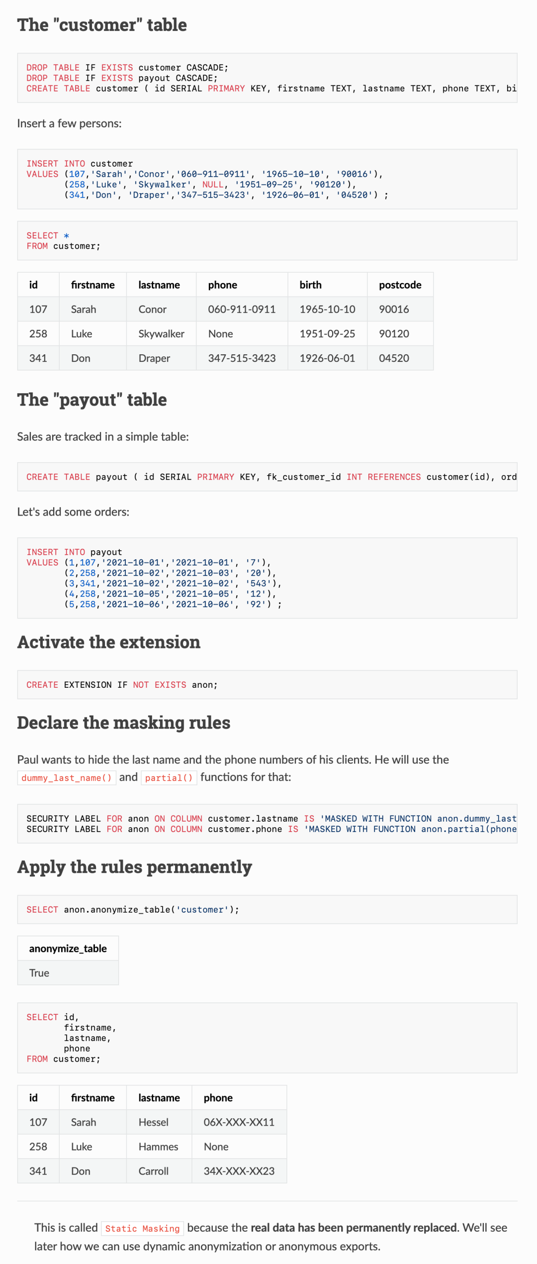 此外,anon 扩展还提供了多种脱敏函数:如随机化、虚构(faking)、局部混淆(partial scrambling)、洗牌(shuffling)、添加噪声(noise),或甚至使用你自定义的函数!最后,该扩展还包含一组检测函数,可以尝试猜测哪些列需要匿名化。