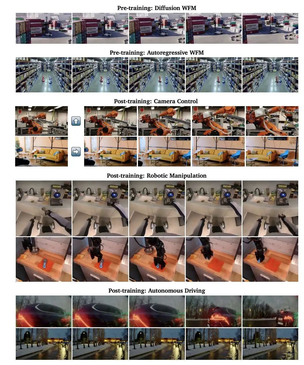 世界模型后训练(World Model Post-training):预训练后的WFM应用于多个物理AI任务,如通过相机姿态输入来进行自由导航,并在仿人类和自动驾驶等任务中进行微调。