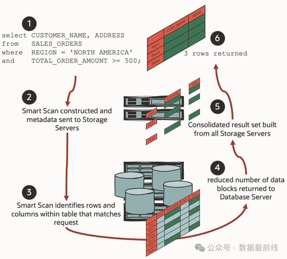 Smart Scan又称为SQL Offload,它将数据密集型SQL操作从数据库服务器直接卸载到存储服务器,通过将SQL处理推到存储服务器,当从磁盘和闪存读取数据时,数据过滤和处理立即在所有存储服务器上并行进行。只有与查询直接相关的行和列才会发送到数据库服务器。通过过滤存储服务器上的行和列,不仅可以减少发送到数据库服务器的数据,而且由于存储服务器中可用的CPU总数增加,扫描通常运行得更快,从而提高了并行性。
