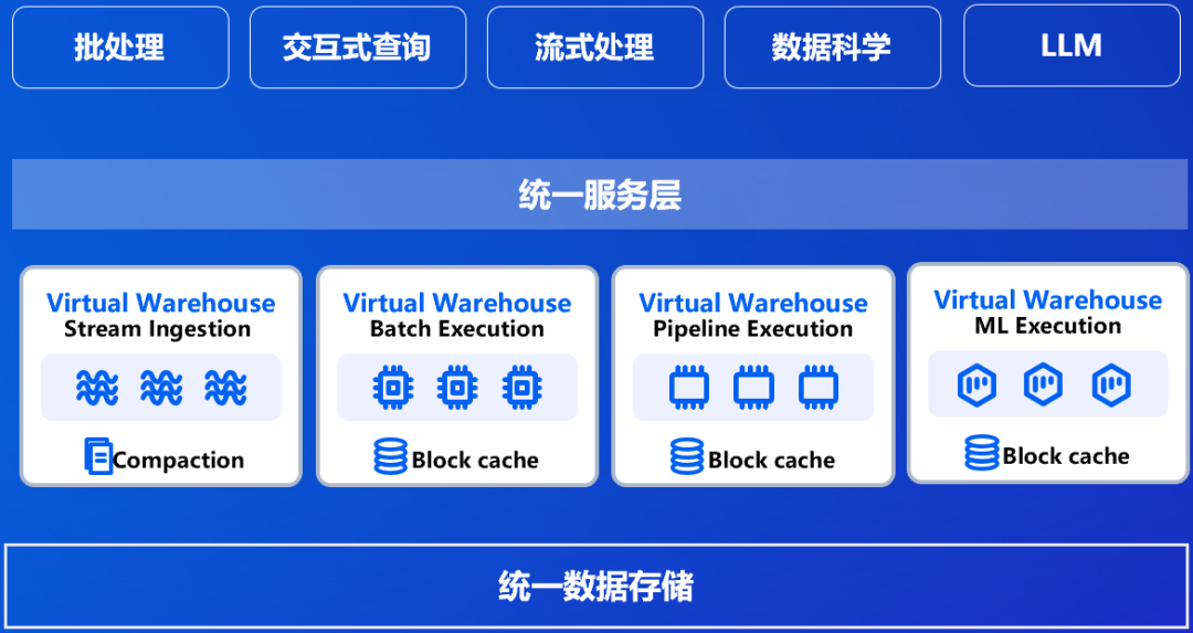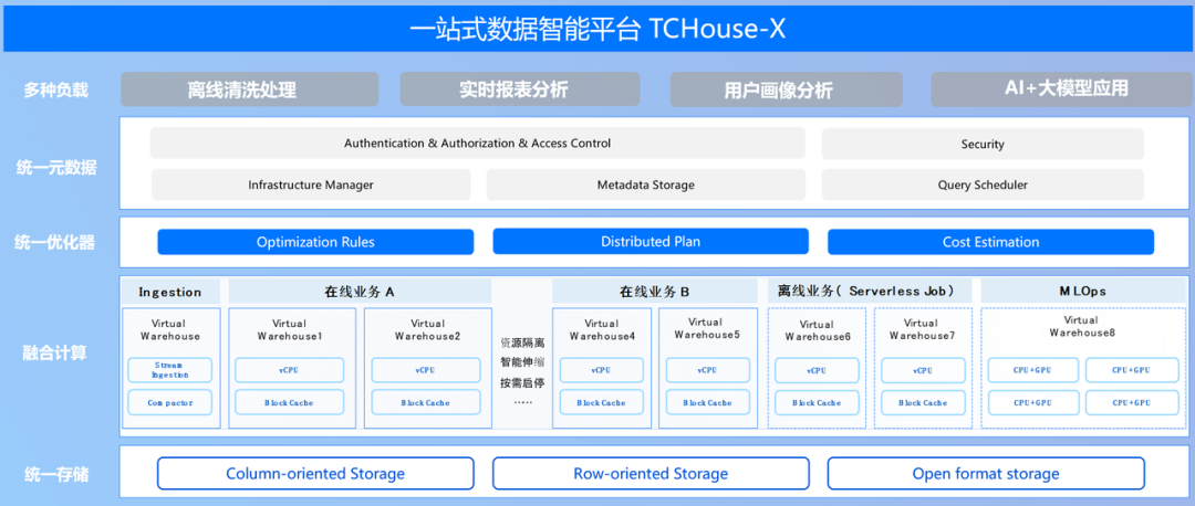 在架构设计方面,TCHouse-X采用了集成化的架构方案,实现了云原生环境下多集群的数据和元数据共享管理。这一设计消除了传统数据平台在处理离线计算、在线计算以及AI开发任务时所面临的障碍。用户现在能够利用同一组数据执行在线分析、离线数据处理、数据湖分析和机器学习等多种业务任务,而无需在不同的系统之间进行切换或复制迁移数据。这使得在同一平台上进行AI、BI和数据开发成为可能,实现了开发和协作的一体化。这一特色可以说是产品的最大亮点,实现了诸多一体化,后文还将进一步展开说明。