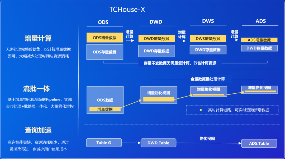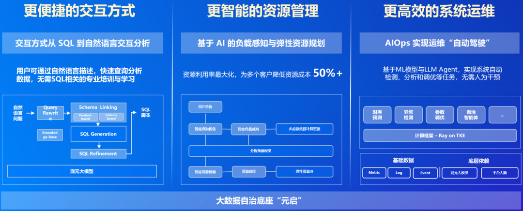 今天我们谈到的 TCHouse-X,正是为了解决上述问题而提出的新一代产品。与以往腾讯云推出的诸多产品不同,这款产品将定位立足于“AI原生的数据平台”,这也是从之前的云原生数仓升级而来。那么这一产品有什么特色呢?我们可用如下五个词来概括:一体化、集约化、高性能、实时性、智能化。