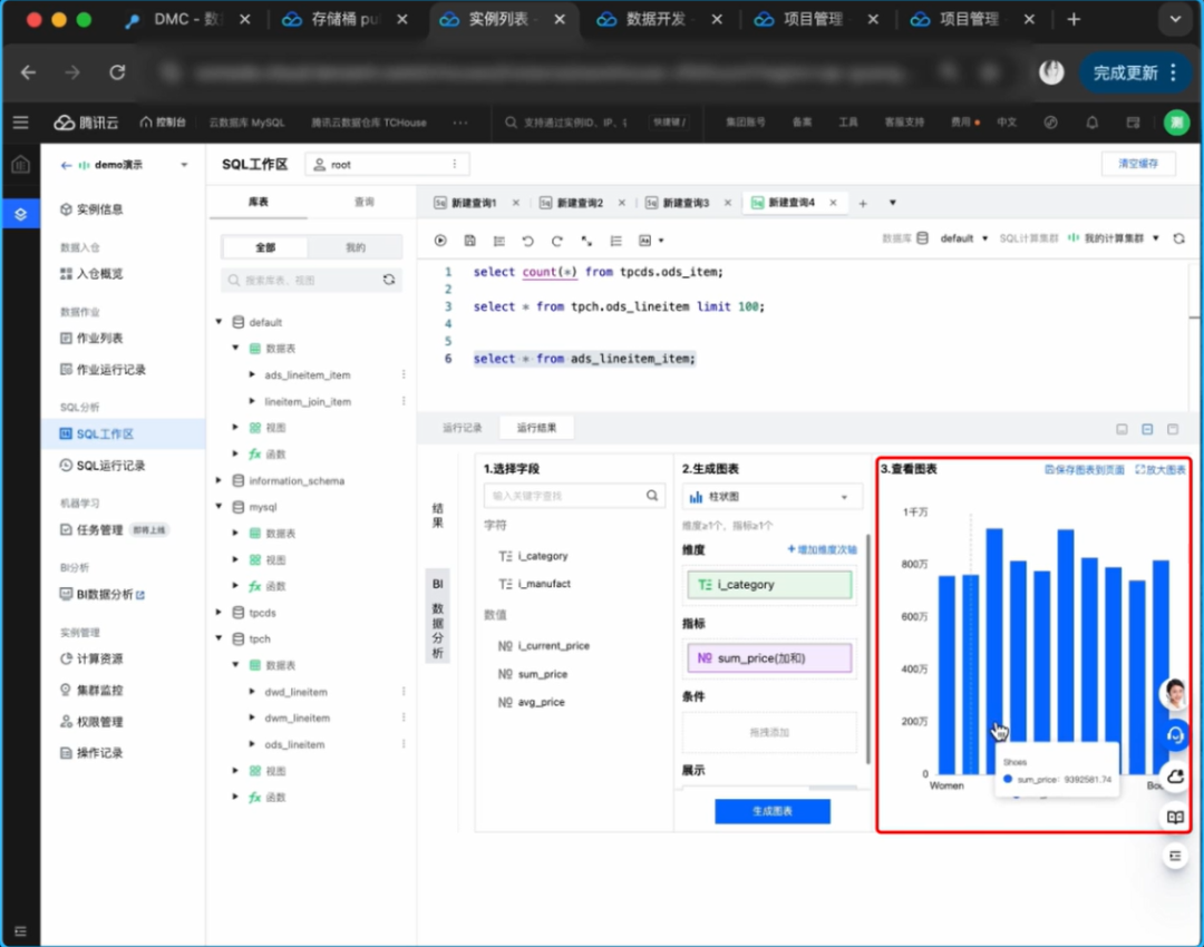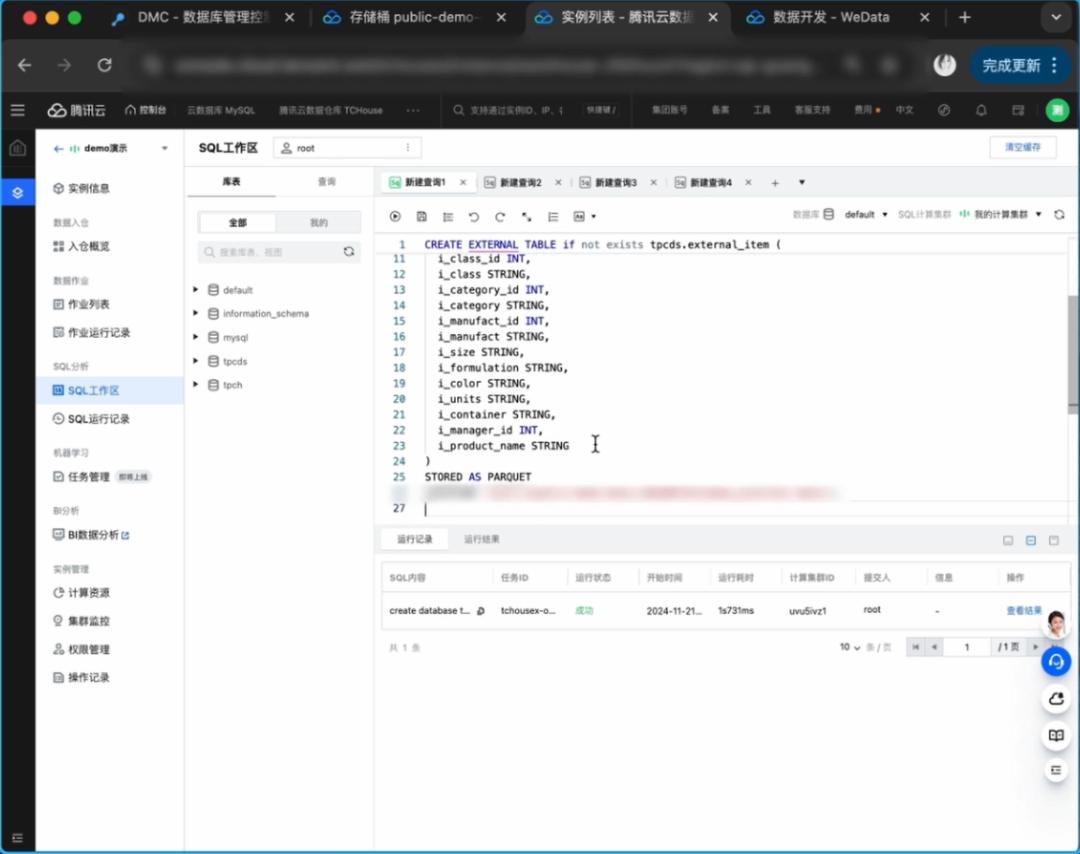 针对新发布的 TCHouse-X 产品,做了个简单的产品体验,整体操作下来还是非常顺滑的。如下图在TCHouse-X 的控制台界面,可以完成对集群实例、数据入仓、SQL分析、任务管理、数据分析等多类工作的管理。在SQL工作区部分,与常用的SQL IDE很类似,用户可以零学习成本快速上手。