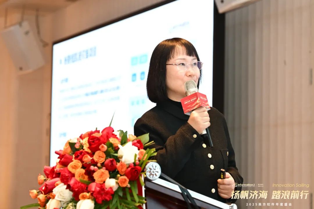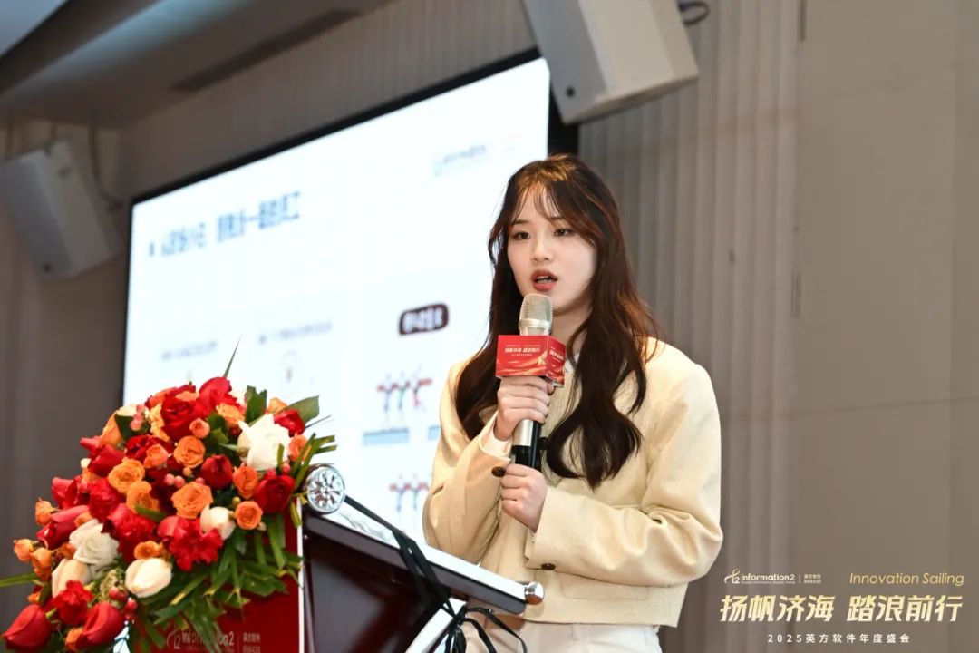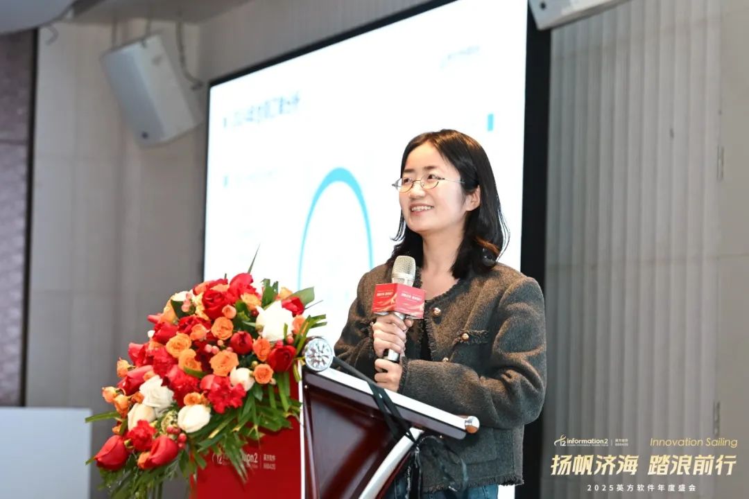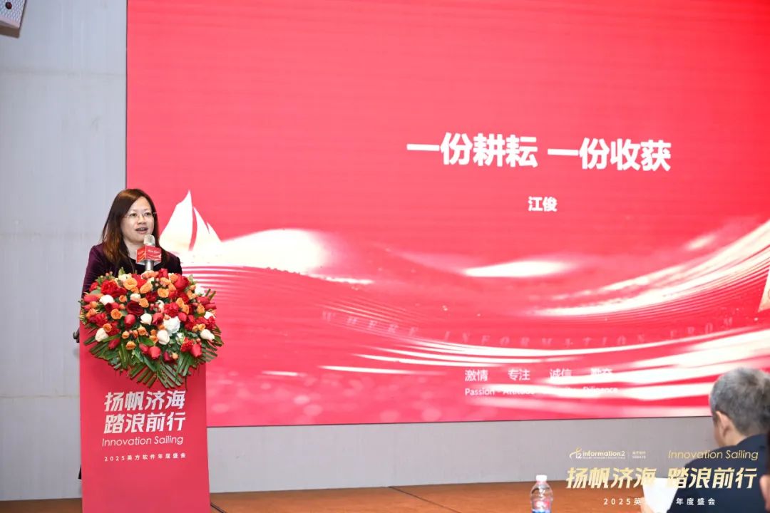 副总经理兼COO江俊的致辞中回顾了英方近年来携手并肩、共同成长的辉煌历程。从历年年会的主题中,可以清晰看到公司文化的发展与传承,每一次的相聚都凝聚着团队的力量,见证了英方人的坚韧与拼搏。她表示,2024年,英方在大客户、产品、技术、创新等多个领域取得了显著成就,这些成果离不开每一个团队的辛勤付出与不懈努力,是他们的专业精神推动了英方软件的稳健前行。