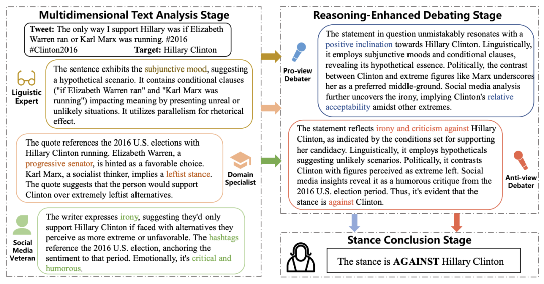 语言分析专家 (Linguistic Expert): 分析语法结构、时态、修辞手法和词汇选择等语言特征,揭示作者的表达方式和情感倾向。 领域分析专家 (Domain Specialist): 解释文本中的领域特定术语,如人物、事件、组织和政治派别等,帮助理解文本的背景和上下文。 社交媒体专家 (Social Media Veteran): 解码社交媒体平台特有的术语和表达风格,如表情符号、网络俚语和情绪标签等,捕捉社交媒体语境下的立场信息。