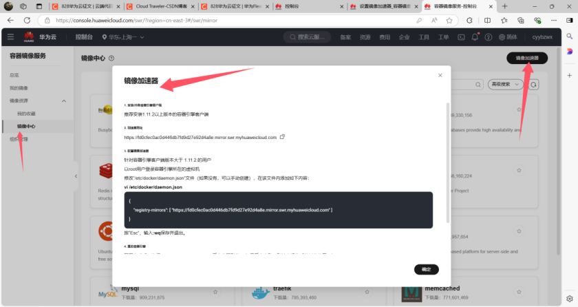 7、docker 配置镜像加速(在华为云镜像中心可获取自己的镜像加速配置)
