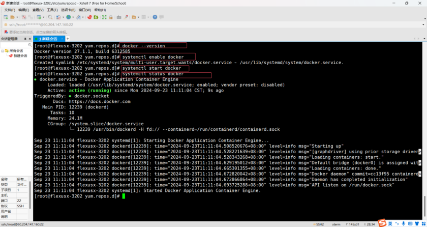 3、验证 Docker 是否安装成功,启动 docker 服务并设置开机自启动,且查看 docker 状态
