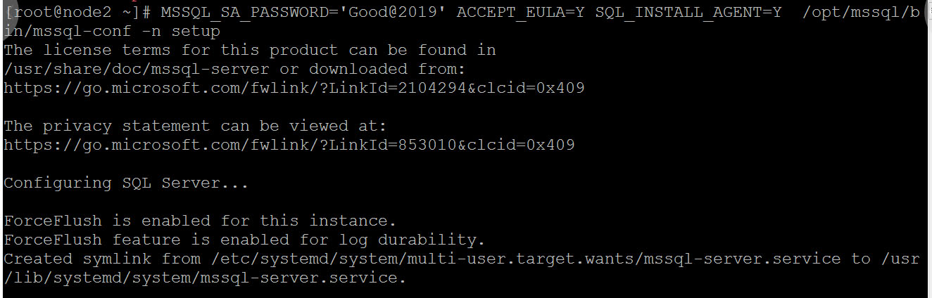 MSSQL_SA_PASSWORD='Good@2019' MSSQL_PID=Enterprise ACCEPT_EULA=Y SQL_INSTALL_AGENT=Y /opt/mssql/bin/mssql-conf -n setup