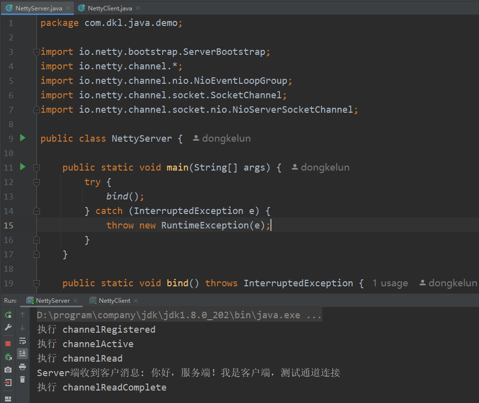 package com.dkl.java.demo;import io.netty.bootstrap.ServerBootstrap;import io.netty.channel.*;import io.netty.channel.nio.NioEventLoopGroup;import io.netty.channel.socket.SocketChannel;import io.netty.channel.socket.nio.NioServerSocketChannel;public class NettyServer {public static void main(String[] args) {try {bind();} catch (InterruptedException e) {throw new RuntimeException(e);}}public static void bind() throws InterruptedException {// 创建boss线程组,用于接收连接EventLoopGroup bossGroup = new NioEventLoopGroup(1);创建worker线程组,用于处理连接上的I/O操作,含有子线程NioEventGroup个数为CPU核数大小的2倍EventLoopGroup workerGroup = new NioEventLoopGroup();try {创建ServerBootstrap实例,服务器启动对象ServerBootstrap bootstrap = new ServerBootstrap();使用链式编程配置参数将boss线程组和worker线程组暂存到ServerBootstrapbootstrap.group(bossGroup, workerGroup);设置服务端Channel类型为NioServerSocketChannel作为通道实现bootstrap.channel(NioServerSocketChannel.class);bootstrap.childHandler(new ChannelInitializer<SocketChannel>() {@Overrideprotected void initChannel(SocketChannel socketChannel) throws Exception {添加ServerHandler到ChannelPipeline,对workerGroup的SocketChannel(客户端)设置处理器socketChannel.pipeline().addLast(new ServerHandler());}});设置启动参数,初始化服务器连接队列大小。服务端处理客户端连接请求是顺序处理,一个时间内只能处理一个客户端请求当有多个客户端同时来请求时,未处理的请求先放入队列中bootstrap.option(ChannelOption.SO_BACKLOG, 1024);绑定端口并启动服务器,bind方法是异步的,sync方法是等待异步操作执行完成,返回ChannelFuture异步对象ChannelFuture channelFuture = bootstrap.bind(8888).sync();等待服务器关闭channelFuture.channel().closeFuture().sync();} finally {优雅地关闭boss线程组bossGroup.shutdownGracefully();优雅地关闭worker线程组workerGroup.shutdownGracefully();}}}