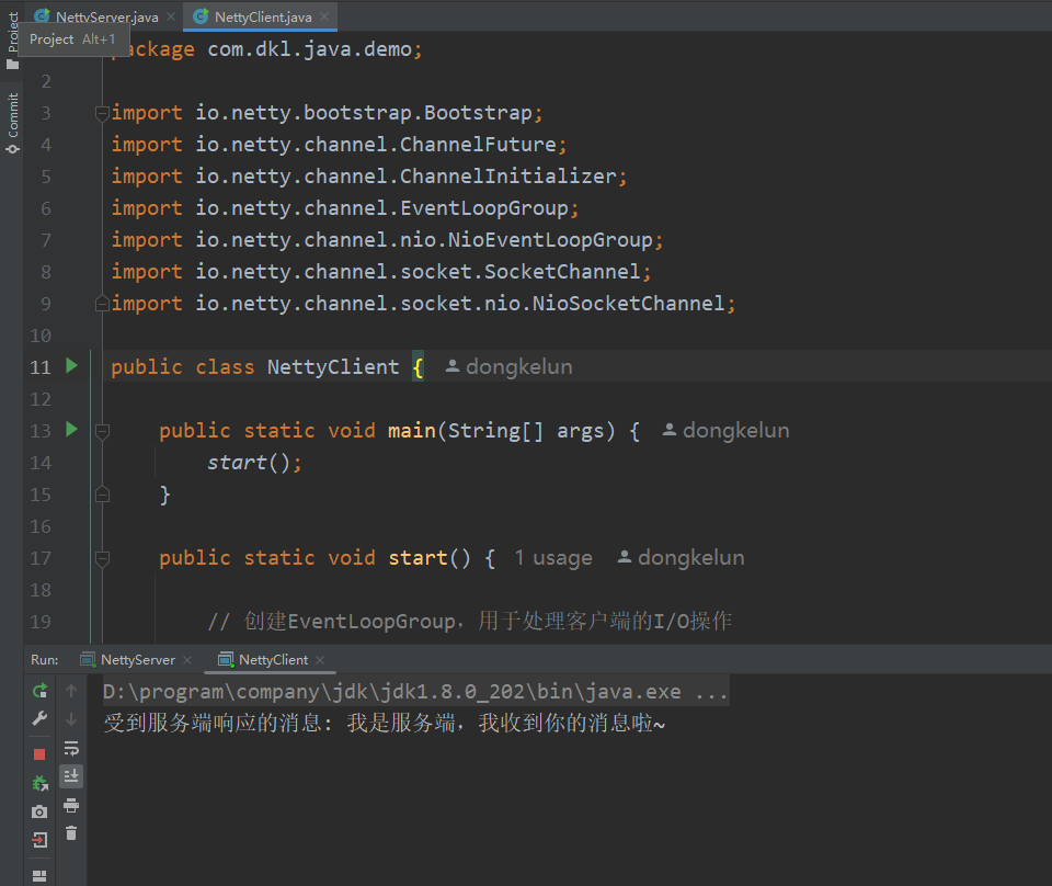 package com.dkl.java.demo;import io.netty.bootstrap.Bootstrap;import io.netty.channel.ChannelFuture;import io.netty.channel.ChannelInitializer;import io.netty.channel.EventLoopGroup;import io.netty.channel.nio.NioEventLoopGroup;import io.netty.channel.socket.SocketChannel;import io.netty.channel.socket.nio.NioSocketChannel;public class NettyClient {public static void main(String[] args) {start();}public static void start() {// 创建EventLoopGroup,用于处理客户端的I/O操作EventLoopGroup groupThread = new NioEventLoopGroup();try {// 创建Bootstrap实例,客户端启动对象Bootstrap bootstrap = new Bootstrap();bootstrap.group(groupThread);// 设置服务端Channel类型为NioSocketChannel作为通道实现bootstrap.channel(NioSocketChannel.class);// 设置客户端处理bootstrap.handler(new ChannelInitializer<SocketChannel>() {@Overrideprotected void initChannel(SocketChannel socketChannel) throws Exception {socketChannel.pipeline().addLast(new ClientHandler());}});// 绑定端口ChannelFuture channelFuture = bootstrap.connect("localhost", 8888).sync();channelFuture.channel().closeFuture().sync();} catch (InterruptedException e) {throw new RuntimeException(e);} finally {// 优雅地关闭线程groupThread.shutdownGracefully();}}}