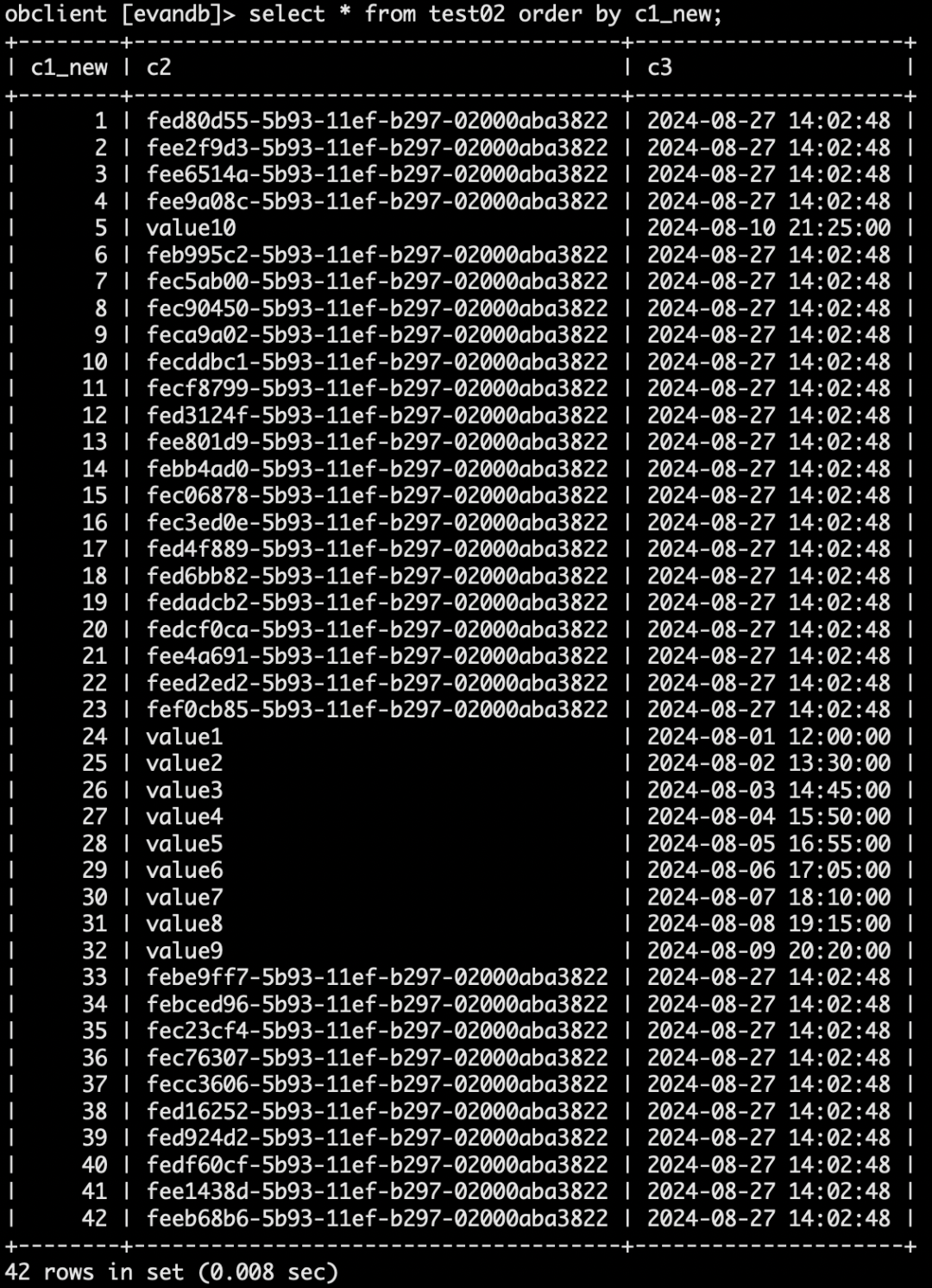 数据校验完成之后执行添加主键,由于 ActionDB 主键必须包含分区键,主键则需设置为(c1_new,c2):