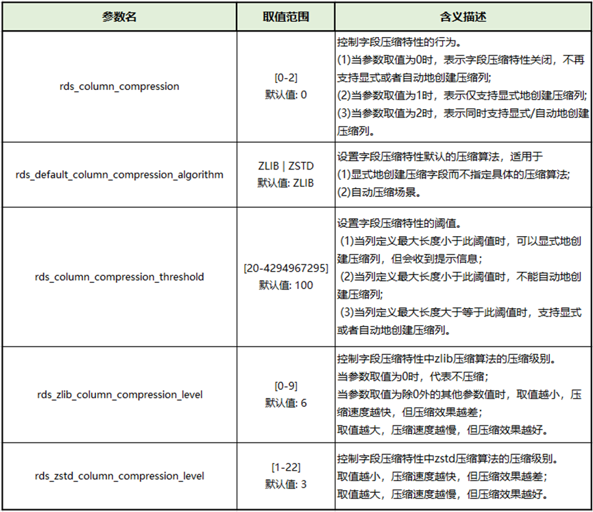 例如,显式地创建压缩字段(如图6,设置默认压缩算法参数rds_default_column_compression_algorithm=ZLIB),在SQL语句中对需要进行压缩的字段显式地标记出压缩属性compressed,若不单独指定压缩算法,则按照rds_default_column_compression_algorithm参数指定的算法使用。