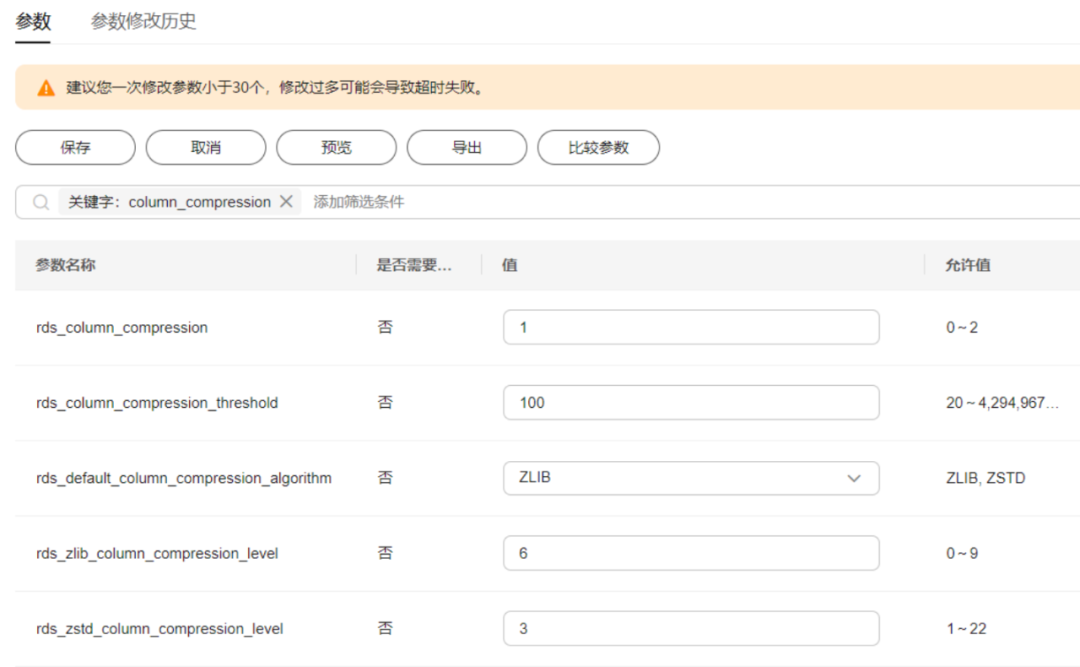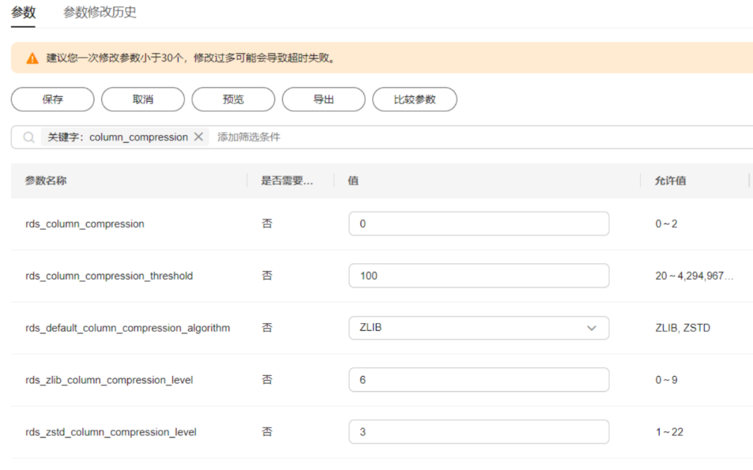 为了使得TaurusDB字段压缩特性更方便地被用户所使用,已开放5个相关参数,在“实例管理”处点击“参数修改-参数”页面即可调整字段压缩参数,如图5所示。