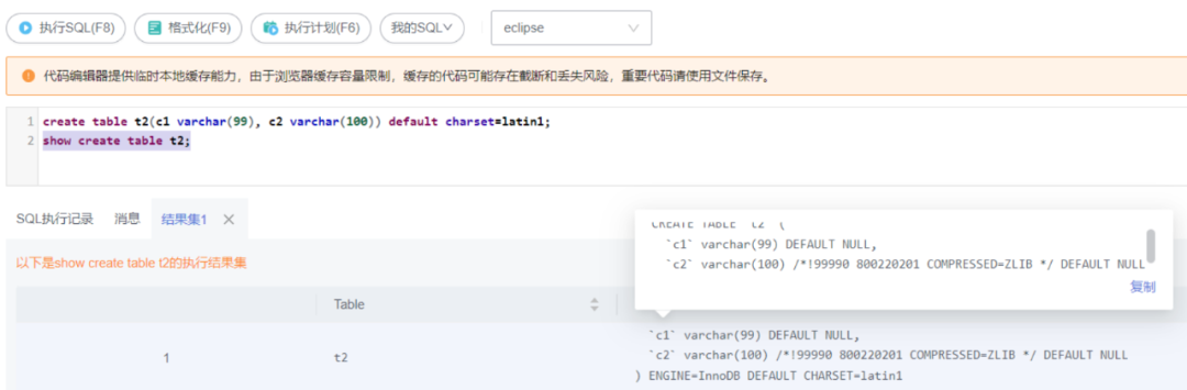 通过展示表结构信息,如果发现其中包含/*!99990 800220201 COMPRESSED=xxxx */的注释内容,可认为该表中的某些字段已使用字段压缩特性,例如:
